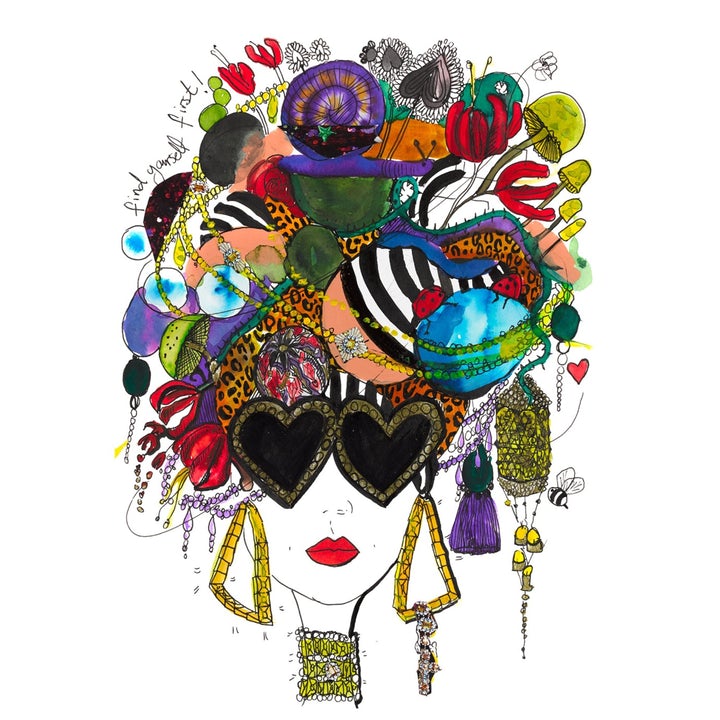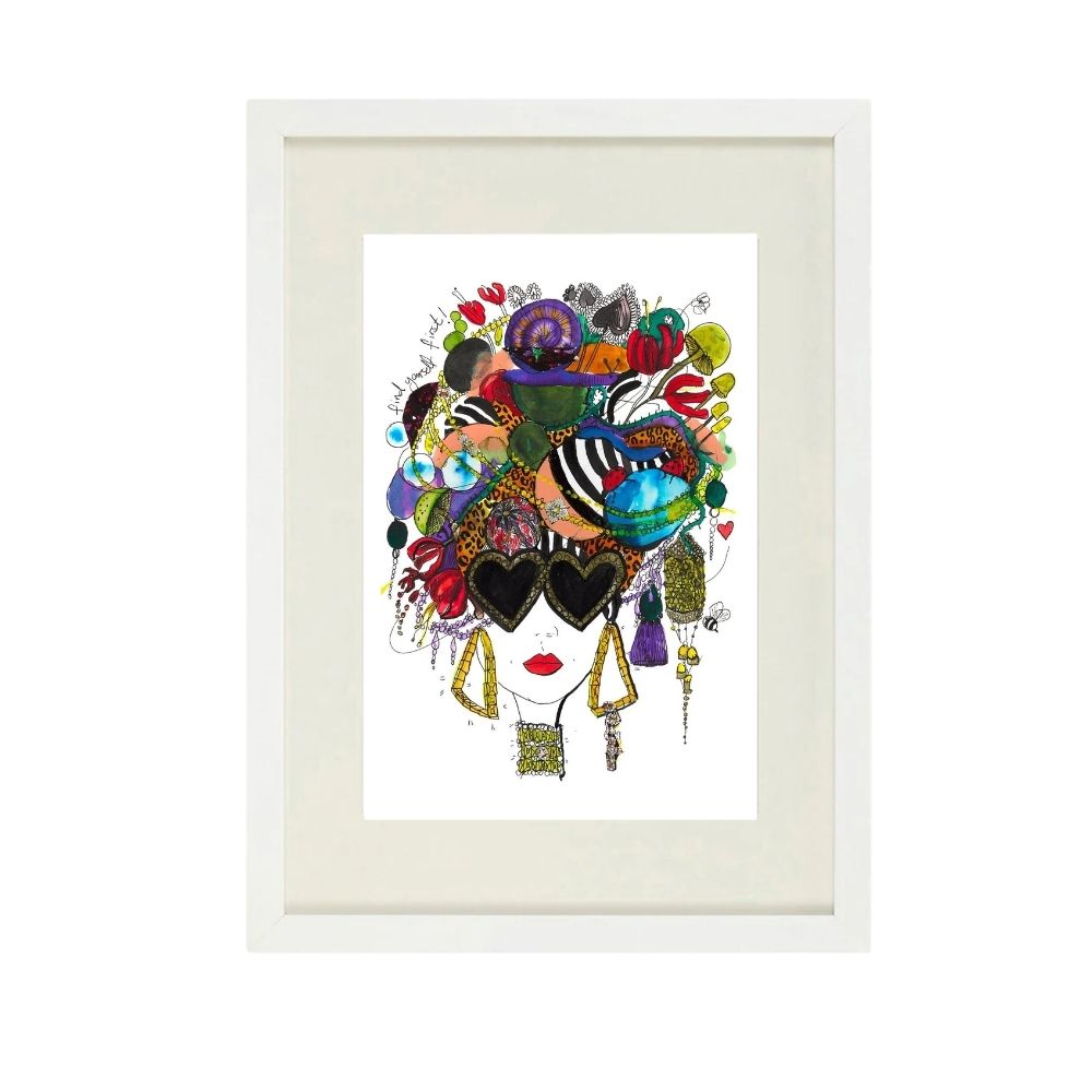 An explosion of colour, character, and self-expression. Find Yourself First features one of Charlotte Posner's most iconic Pop Doll figures a woman with wild, rainbow-hued hair bursting with flowers and patterns, wearing heart-shaped sunglasses. A powerful, positive message wrapped in the most vibrant artwork.