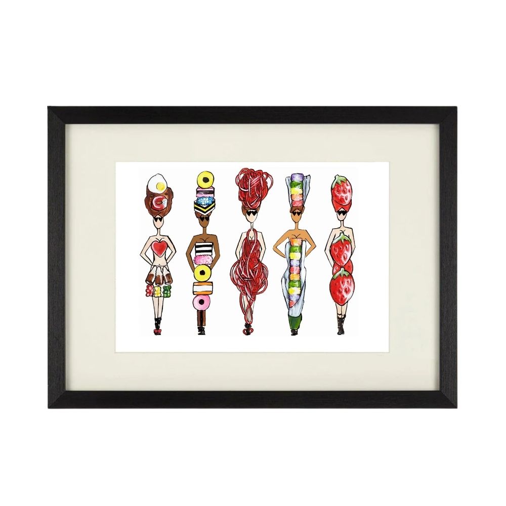 Sugar, spice, and everything fabulous. Hello Sweetie features five Pop Doll women each made entirely of sweets and candy, from candy-stripe legs to lollipop heads and marshmallow skirts. In the black frame, all that vibrant colour becomes even more vivid and gallery-worthy.