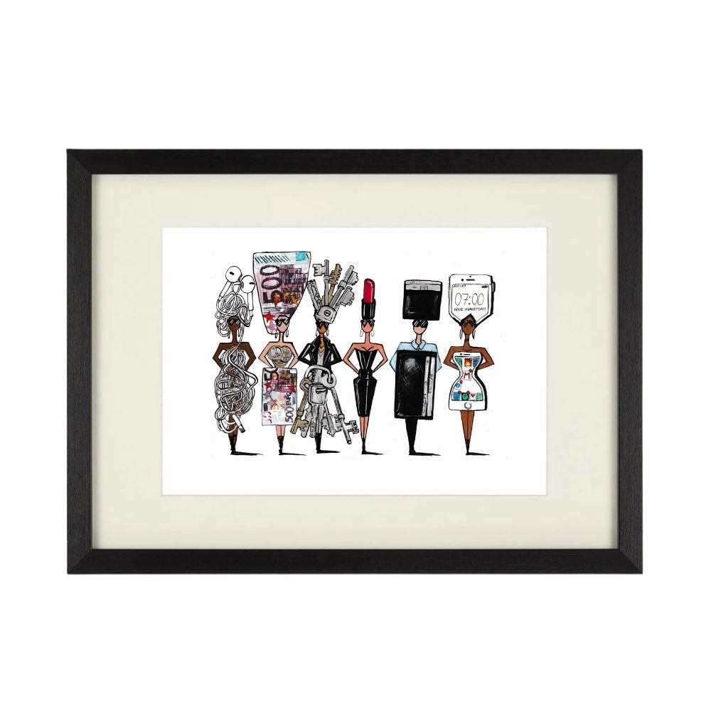 What's in your bag? Remember Me features five Pop Doll women each transformed into the everyday essentials we can never leave the house without keys, phone, card, lipstick, and headphones. In the black frame, this witty, relatable composition feels sleek and gallery-worthy.