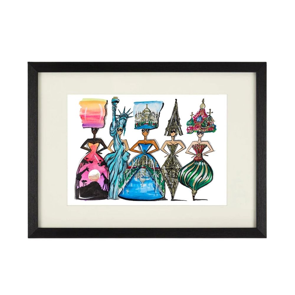Five glamorous Pop Doll figures each embodying a different corner of the world from the African savannah to the Statue of Liberty, the Taj Mahal, the Eiffel Tower, and onion-domed Russia. Travels is a joyful, wanderlust-fuelled limited edition print by British Pop artist Charlotte Posner, capturing the beauty of global adventure through her signature playful lens.