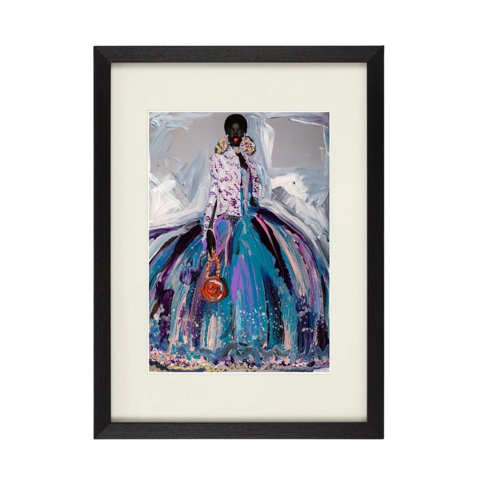Drama, movement, and breathtaking colour. Une Robe du Soir 'An Evening Gown' captures a solitary figure in a sweeping teal and purple ballgown, painted with expressive brushstrokes that command the wall. In the black frame, this piece takes on an even more dramatic, gallery-worthy presence.
