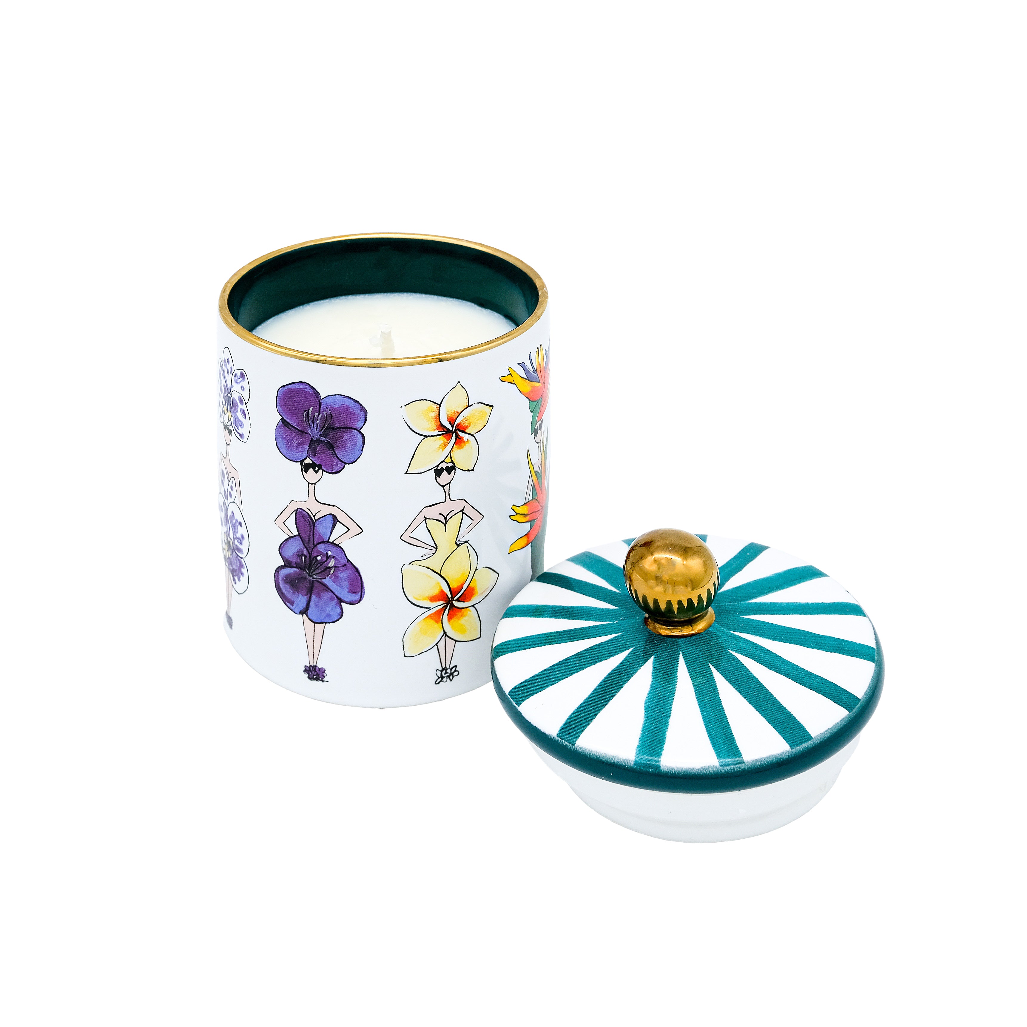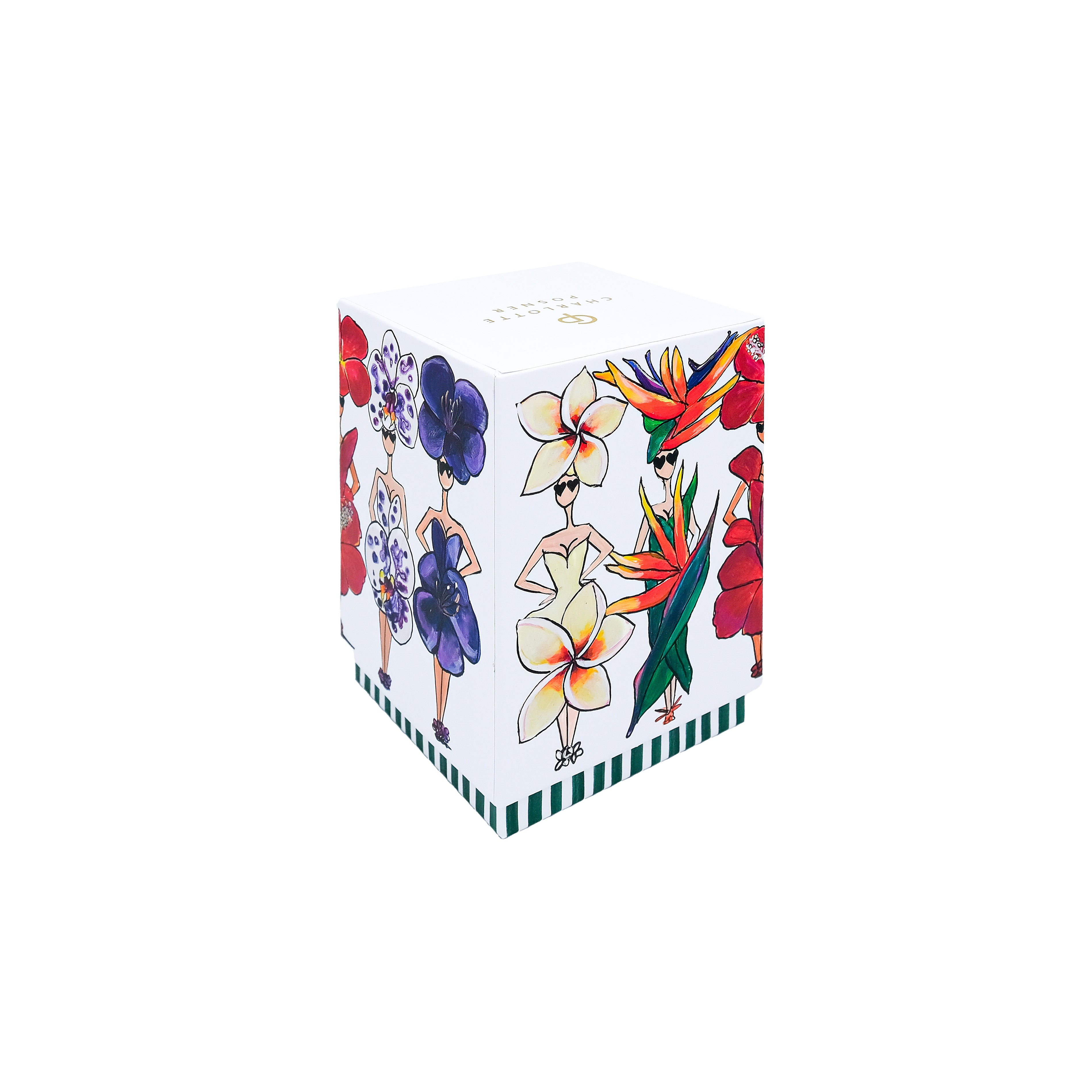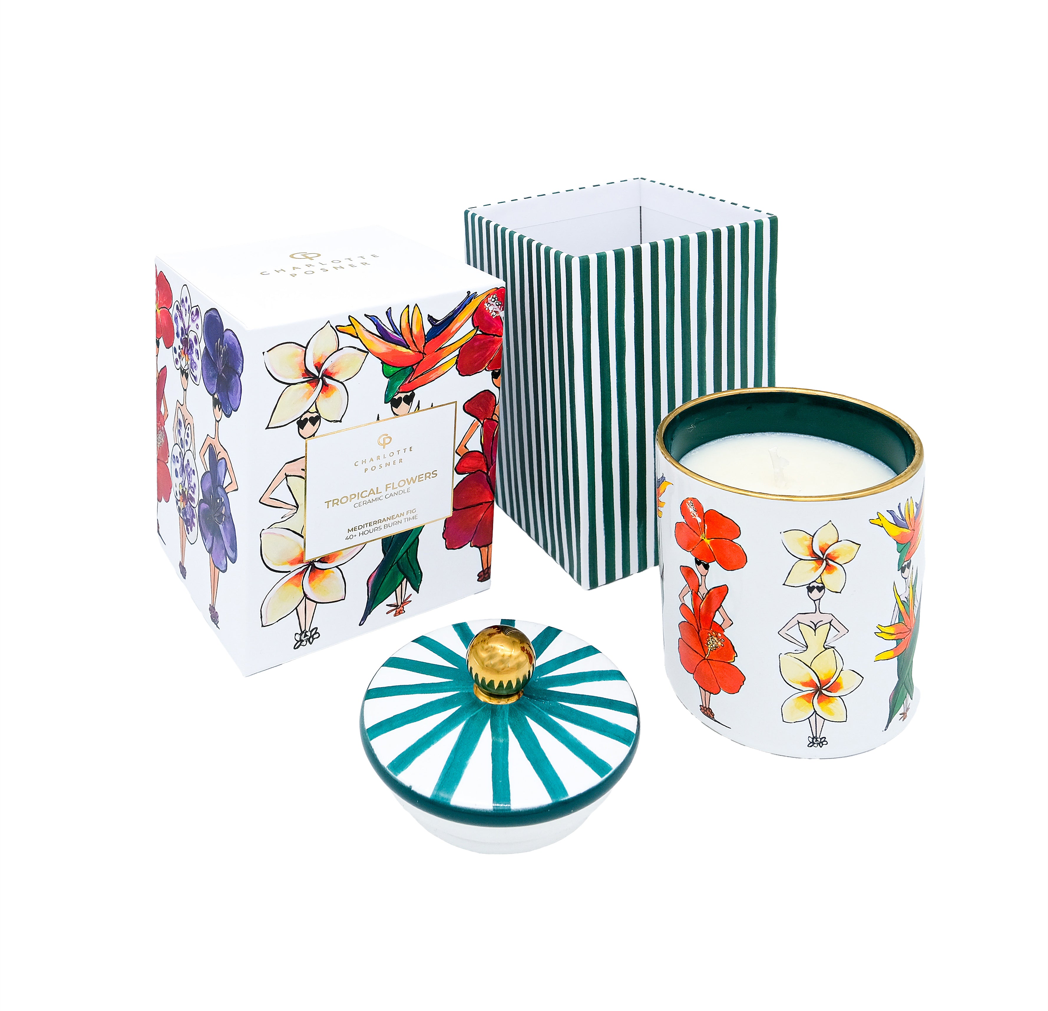 Relax, unwind, and add a touch of creative charm to your space with the Tropical Flowers Candle by Charlotte Posner. This luxury candle blends elegant floral notes and mediterranean fig for a fresh, modern scent – all presented in a beautifully illustrated ceramic vessel featuring Charlotte’s signature Pop Dolls design.